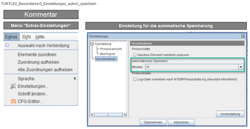 Unter Einstellungen sollte lediglich die Zeit für das automatische Speichern angepasst werden.